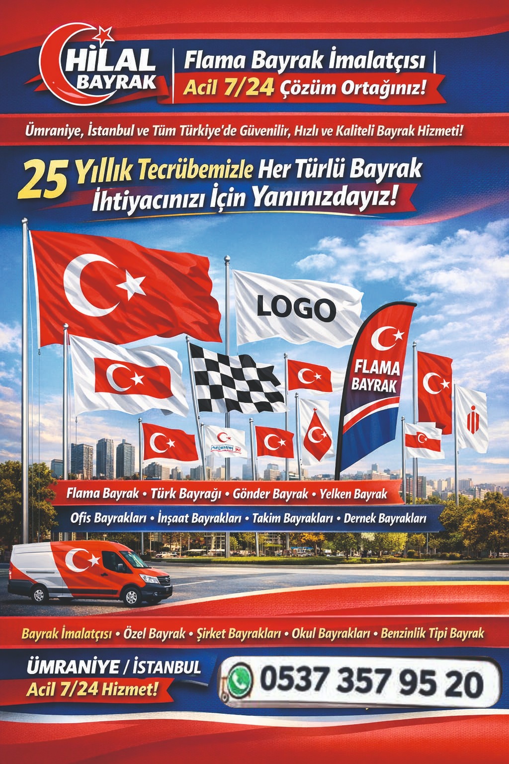 Ümraniye, İstanbul merkezli üretimimizle ve Türkiye genelindeki acil 7/24 hizmetimizle bayrak sektörünün lideri olmaktan gurur duyuyoruz.