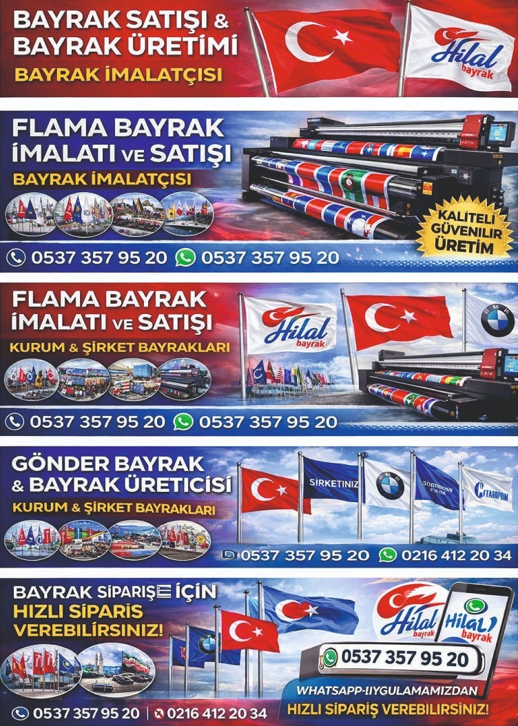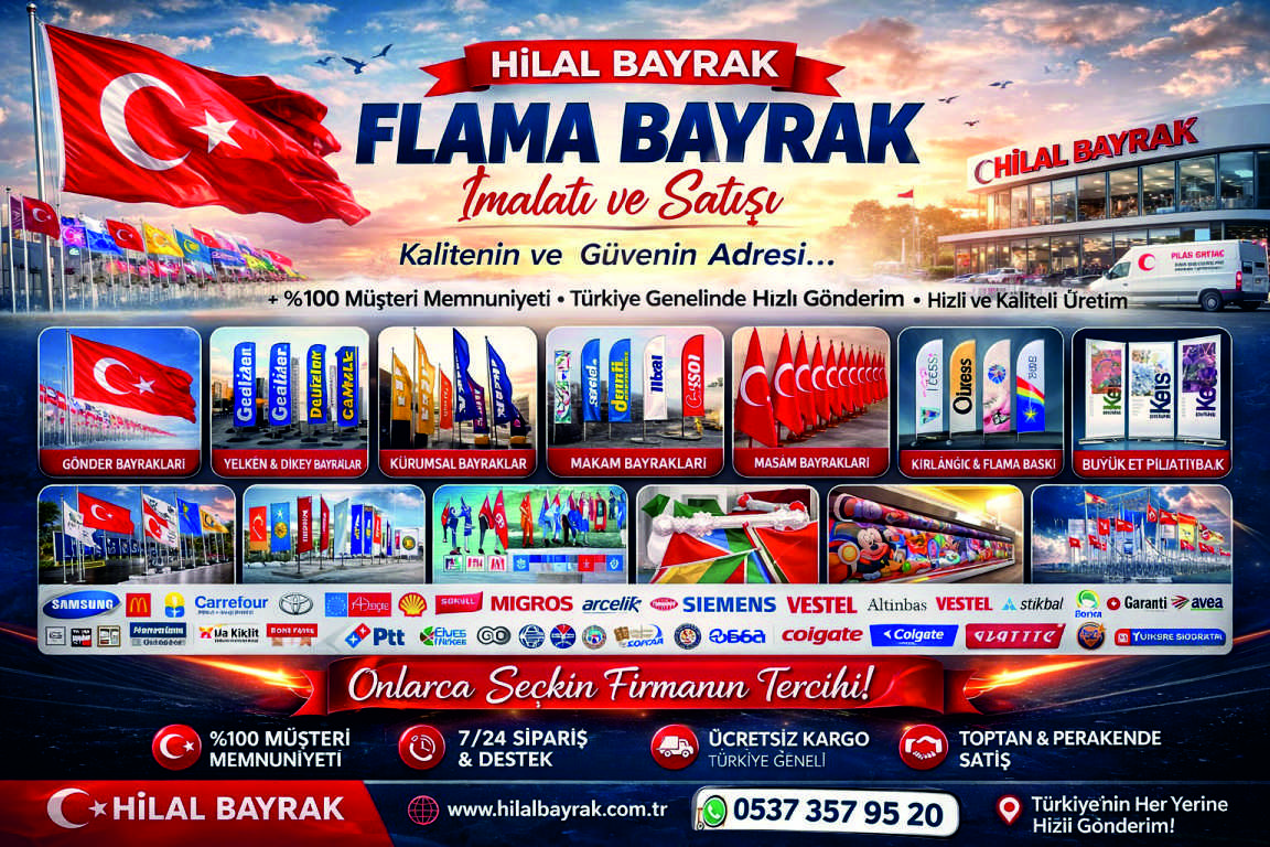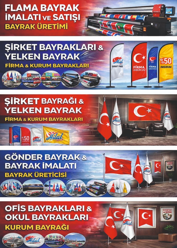 ✅ Flama Bayrak İmalatı & Üretimi ✅ Gönder Bayrak & Makam Bayrakları ✅ Türk Bayrağı & Ülke Bayrakları ✅ Atatürk Posterleri & Eski Türk Devletleri Bayrak Setleri ✅ Dijital Baskı & Bez Afiş Üretimi ✅ Kurum, Şirket, Okul & Taraftar Bayrakları ✅ Masa Bayrağı, L Tipi Bayrak, Roll-Up, Dubalı Bayrak ✅ Özel Tasarım & Logolu Bayraklar Türk Bayrağı Bayrak İmalatı Gönder Bayrak İmalatı Makam Bayrağı Şirket Bayrakları Kurumsal Bayraklar Masa Bayrağı Okul Bayrakları Kırlangıç Flama Logolu Bayraklar Süslü Flamalar Ülke Bayrakları Neden Hilal Bayrak? %100 Yerli Üretim Kaliteli Malzemeler ve Uzun Ömürlü Baskı Hızlı Teslimat Özel Tasarım ve Ölçü Seçenekleri Acil 7/24 Hizmet